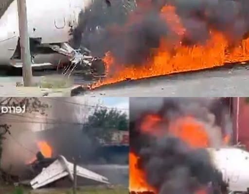 Aerial view of an airport crash site with large flames and thick black smoke.